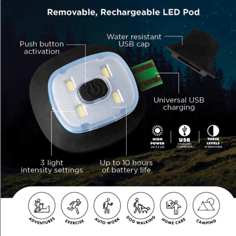 The Night Scope Rechargeable LED Beanie offers hands-free visibility in low-light settings. Utilize the push-button LED to rotate between three levels of brightness, remove light to wash and recharge as needed for hours of illumination. Great for every day exercise, camping, hiking, small spaces and projects. Fits any standard USB port. Own the night! Camo and Blaze Orange represent the Sportsman Series, which has a lower profile than the other colors.